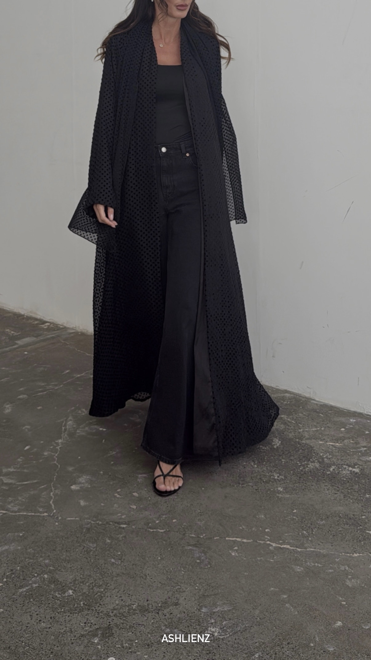 A luxurious abaya adorned with subtle velvet dots, paired with a matching shaila ..